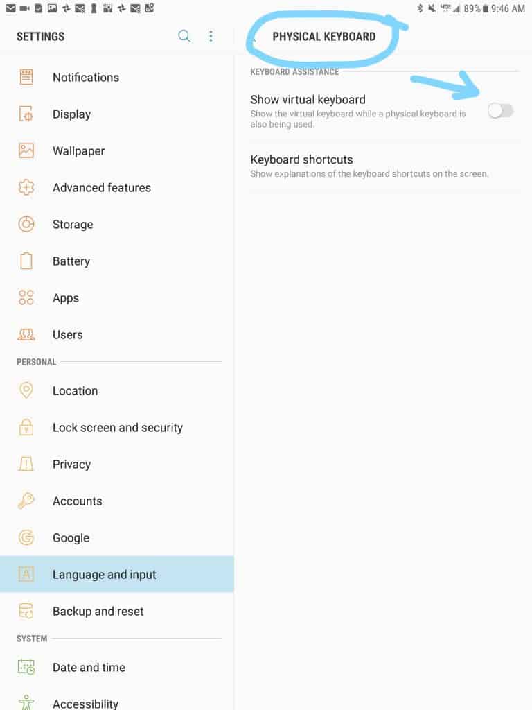 Once in the Physical Keyboard – enable the “show virtual keyboard” option – See below