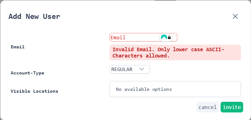 Enter the email of the user you are inviting. NOTE: Only lower case ASCII characters (lower case letters) are allowed.