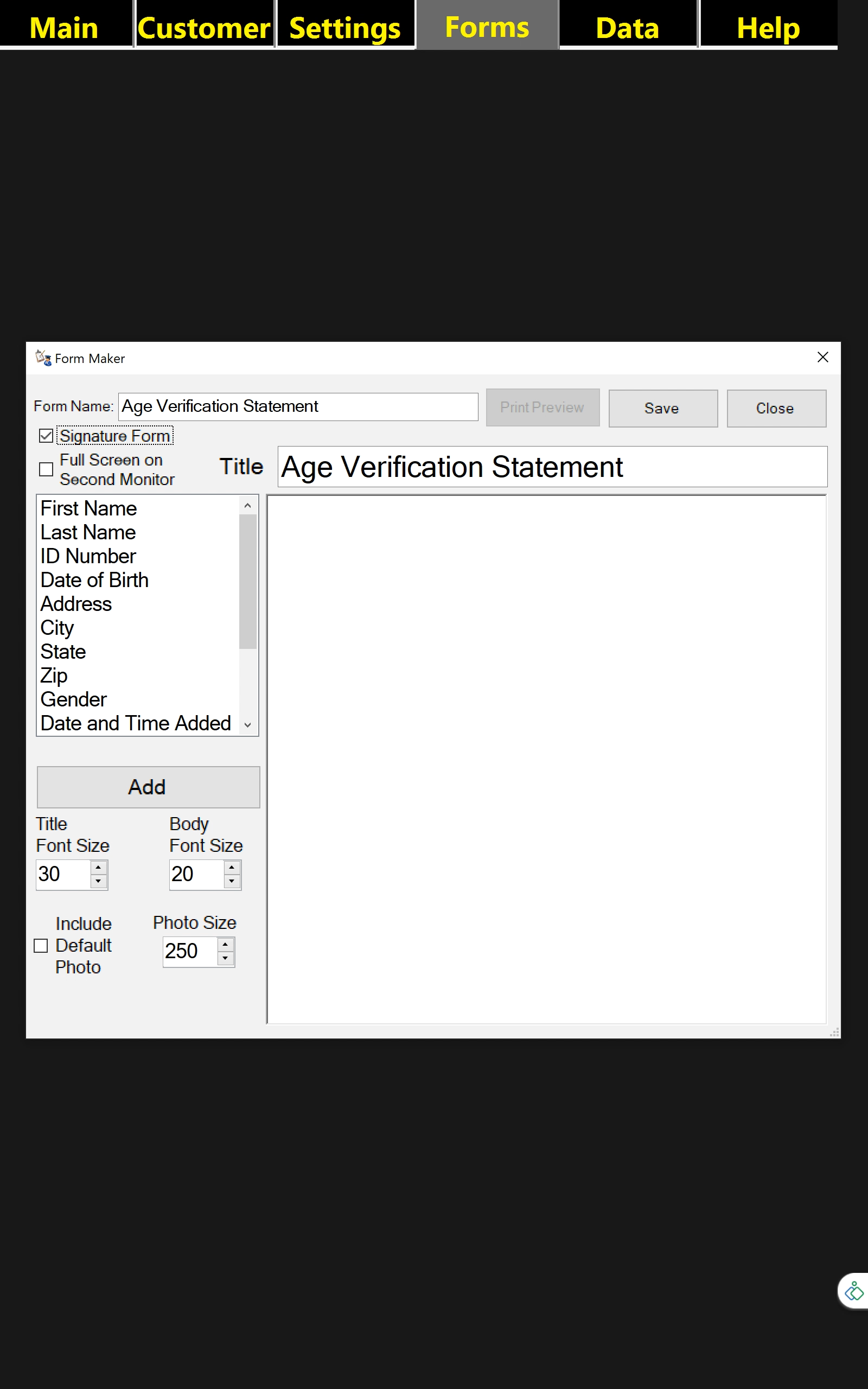 Description: Create a form that will auto-populate with the ID’s contact information and capture their signature with a date/time stamp. Shown below is the CT Age Verification Statement