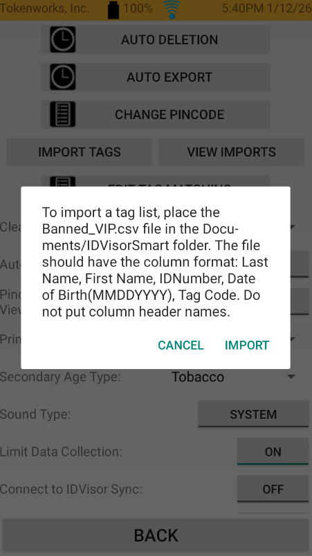 Description: If you have list of customers that you would like to ban, make VIP, etc. You can upload a tag list on to your IDVisor Smart/Smart Plus. You can also upload existing tag lists from previous generation scanners if you have upgraded to a IDVisor Smart/Smart Plus.
