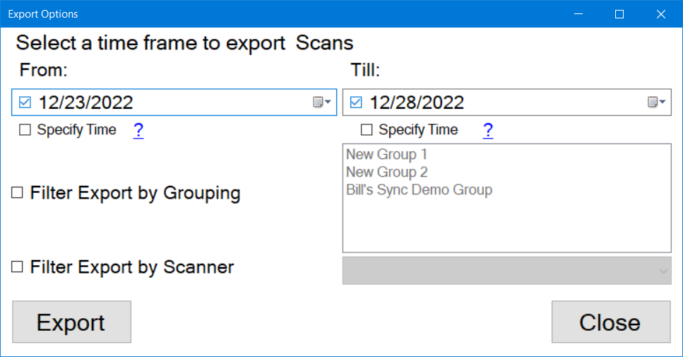 by specified time, group, and/or scanner.