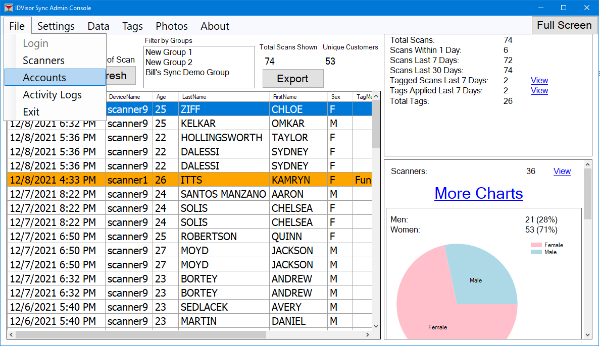 customers scanned) and/or Scans (list of real time scans).